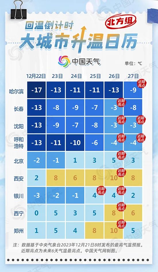 从中国天气网推出的大城市升温日历可以看到,明天,北方大部率先升温,大城市中,西安、郑州最高气温将重回冰点以上。到了本周末,西安最高气温或达8℃,北京最高气温也可能升至0℃以上,长春升至-7℃左右,基本回到与常年同期持平的状态。下周初,各地气温将纷纷升至近期高点,26日,西安、郑州最高气温或达10℃,北京最高气温将有5℃,长春、呼和浩特回升至-3℃左右;哈尔滨27日最高气温也将达到-9℃,较常年同期偏高。