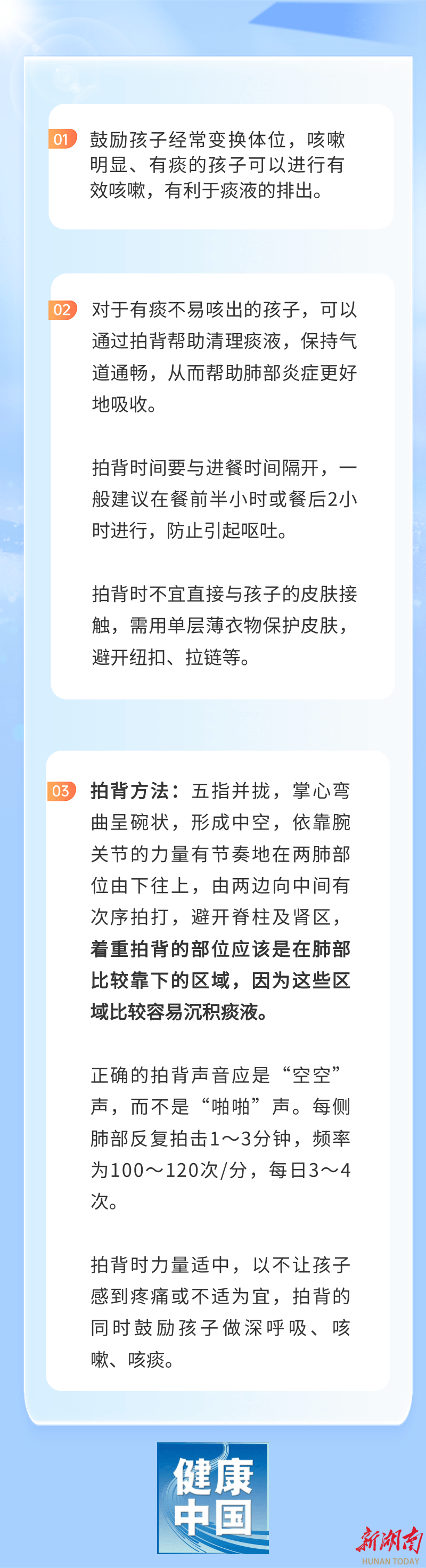 咳嗽是一种症状而不是疾病,是孩子生病时的“报警信号”。由于儿童咳嗽反射较弱,痰液容易在气道内潴留引起气道阻塞,这时通过拍背排痰,可以促进痰液排出,保持呼吸道通畅。