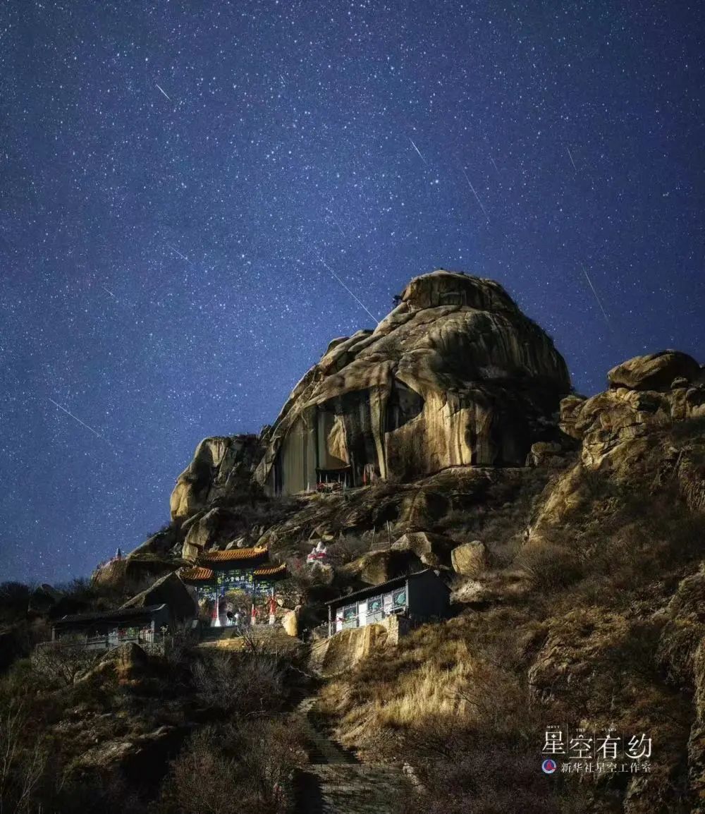 浙江星空摄影爱好者周熠君2022年1月4日在浙江新昌天姥山拍摄的象限仪座流星雨(多张叠加)。(本人供图)