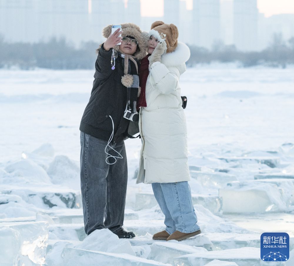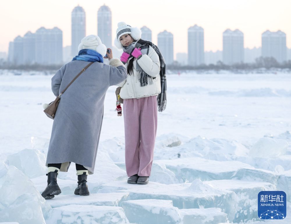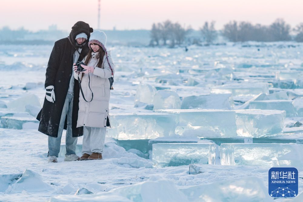 1月7日,在封冻的松花江哈尔滨段,游客在“钻石海”留影。
