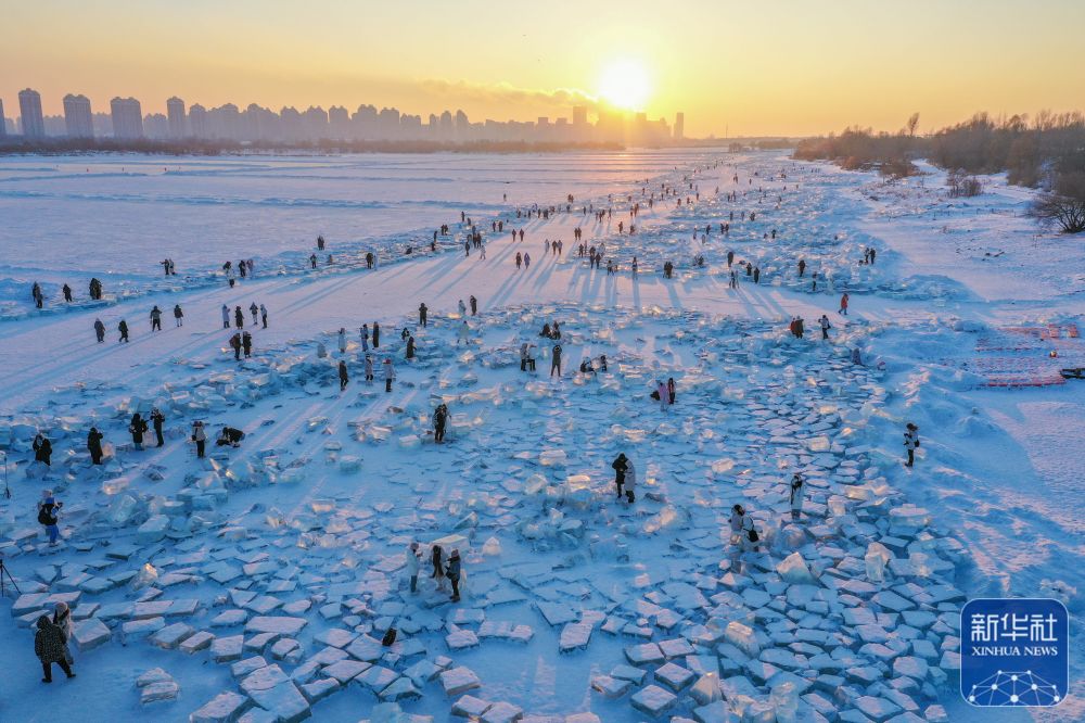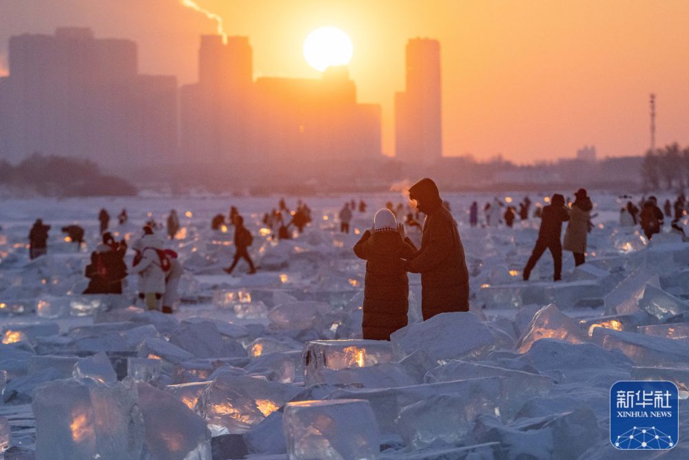 1月7日,在封冻的松花江哈尔滨段,游客在日落时分的“钻石海”游玩。