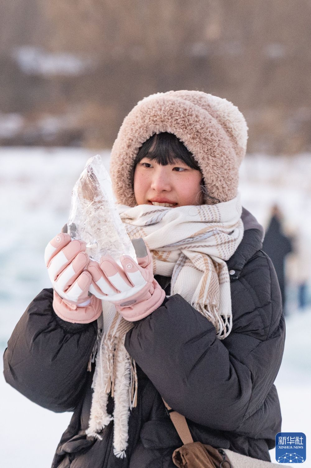 1月7日,在封冻的松花江哈尔滨段,游客在“钻石海”拾起一块“碎钻”。