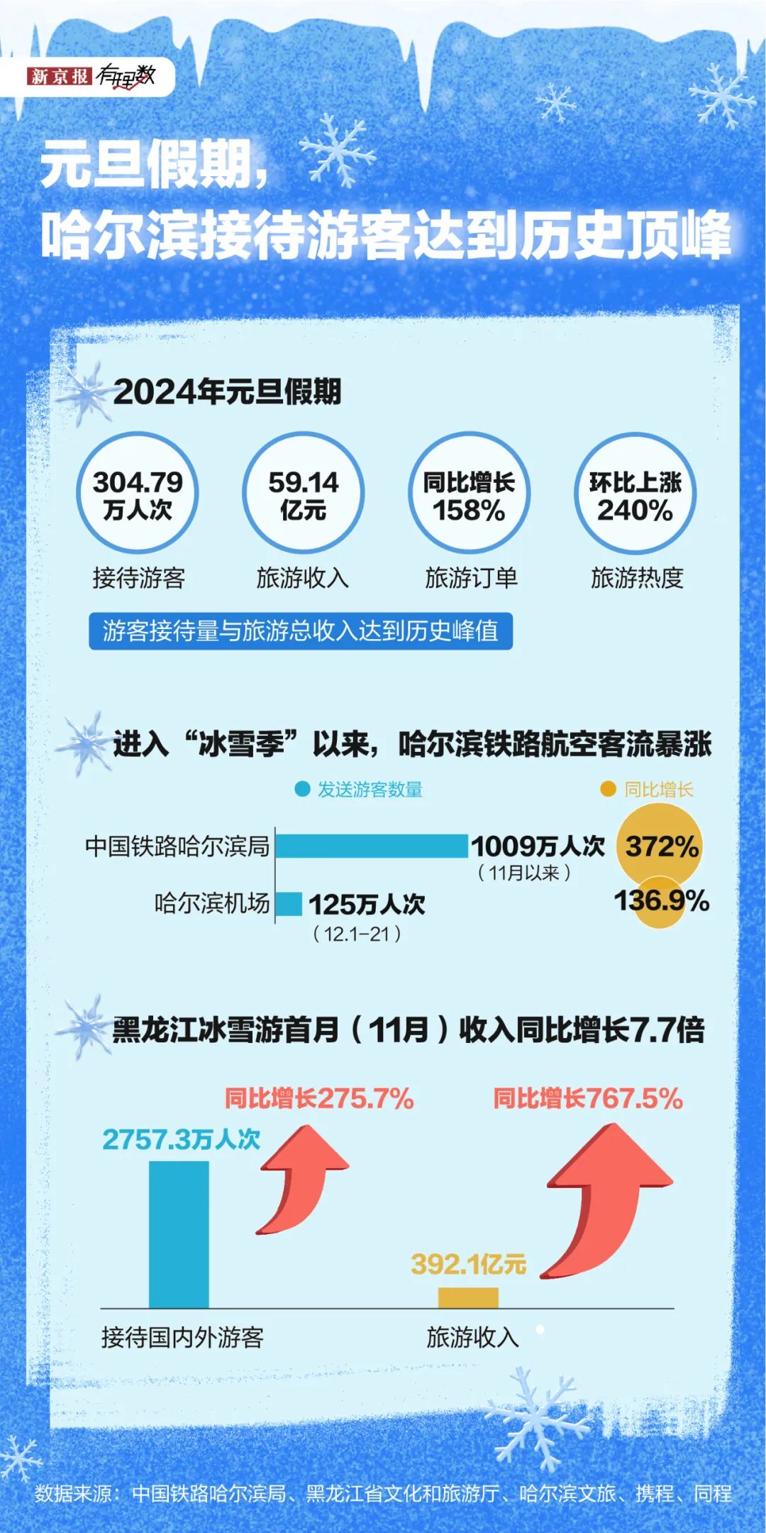 铁路部门数据显示,11月份以来,哈铁累计发送旅客1009万人次,同比增长372%,哈尔滨、亚布力、漠河、伊春等热门冰雪旅游城市成为全国游客首选目的地。从12月1日到21日,哈尔滨机场运送旅客125万人次,同比2022年增长136.9%,其中游客占6成左右。
