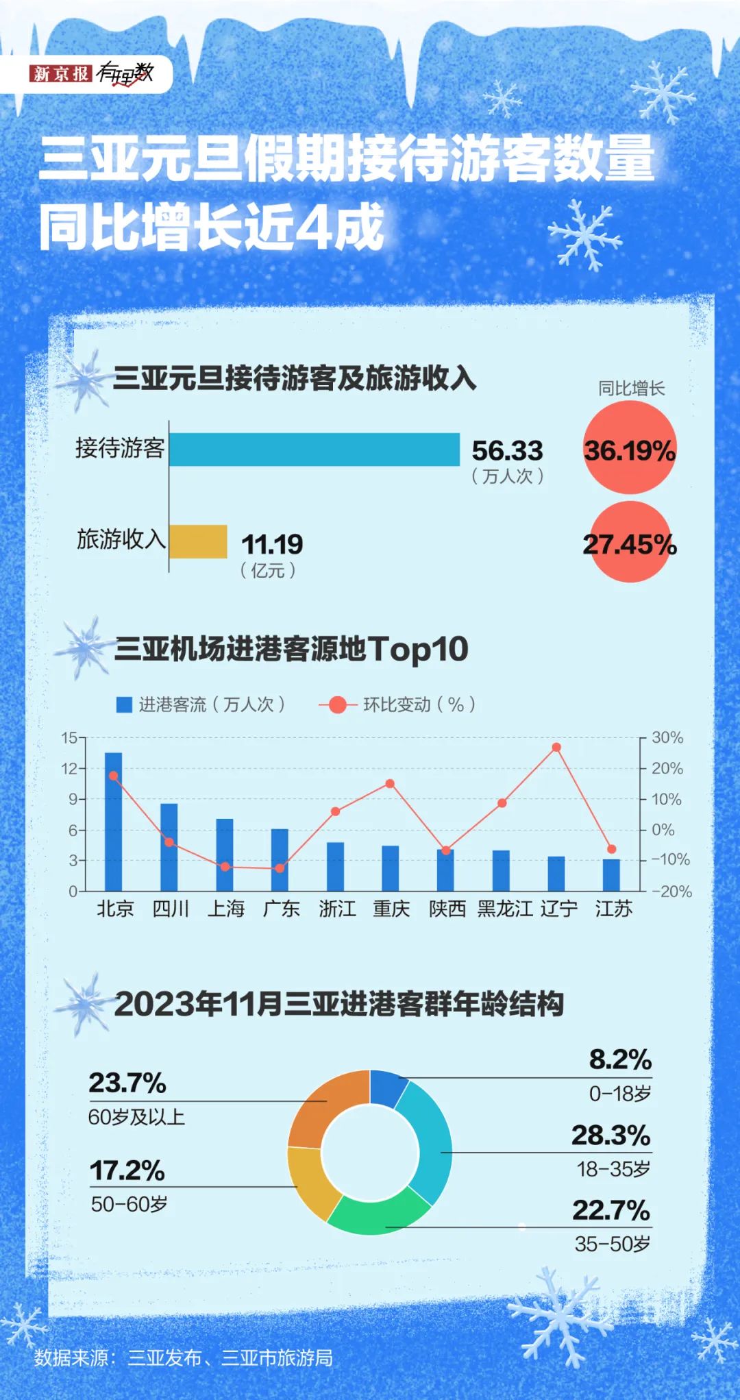 据三亚文旅局数据,元旦假日期间三亚全市共接待游客56.33万人次,实现旅游总收入11.19亿元。从这两项数据上来看的确没有哈尔滨火热,但接待游客和旅游收入都实现了同比增长,分别为36.19%和27.45%。