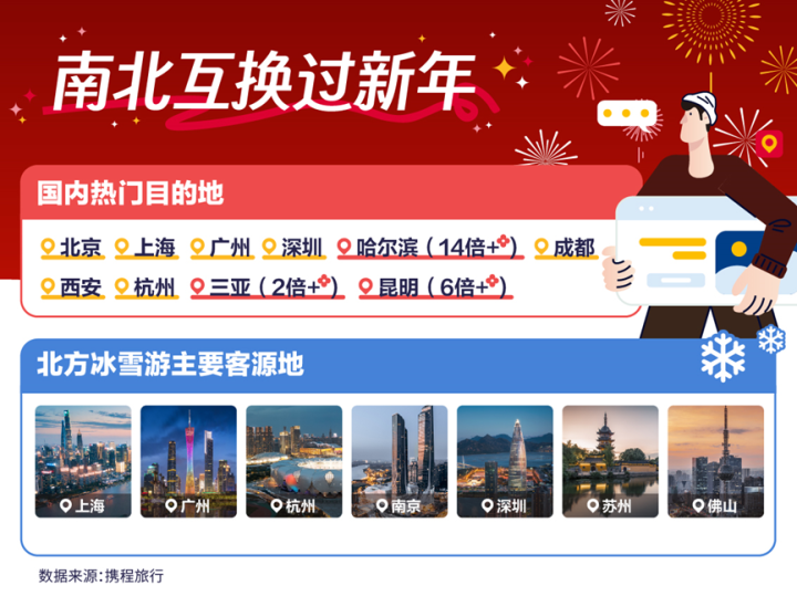 哈尔滨的雪花、上海的繁花,给2024年旅游行业带来开门红,也反映“南北居民互换过年”的趋势。携程数据显示,春节期间,国内热门目的地为北京、上海、广州、深圳、哈尔滨、成都、西安、杭州、三亚、昆明。北方城市哈尔滨旅游热度从元旦延续至春节假期,从2023年未进入前十攀升至2024年第五位,旅游预订订单同比增长超14倍。而三亚、昆明等北方游客喜欢的避寒游城市,截至目前,旅游预订订单同比增长分别超2倍、超6倍。