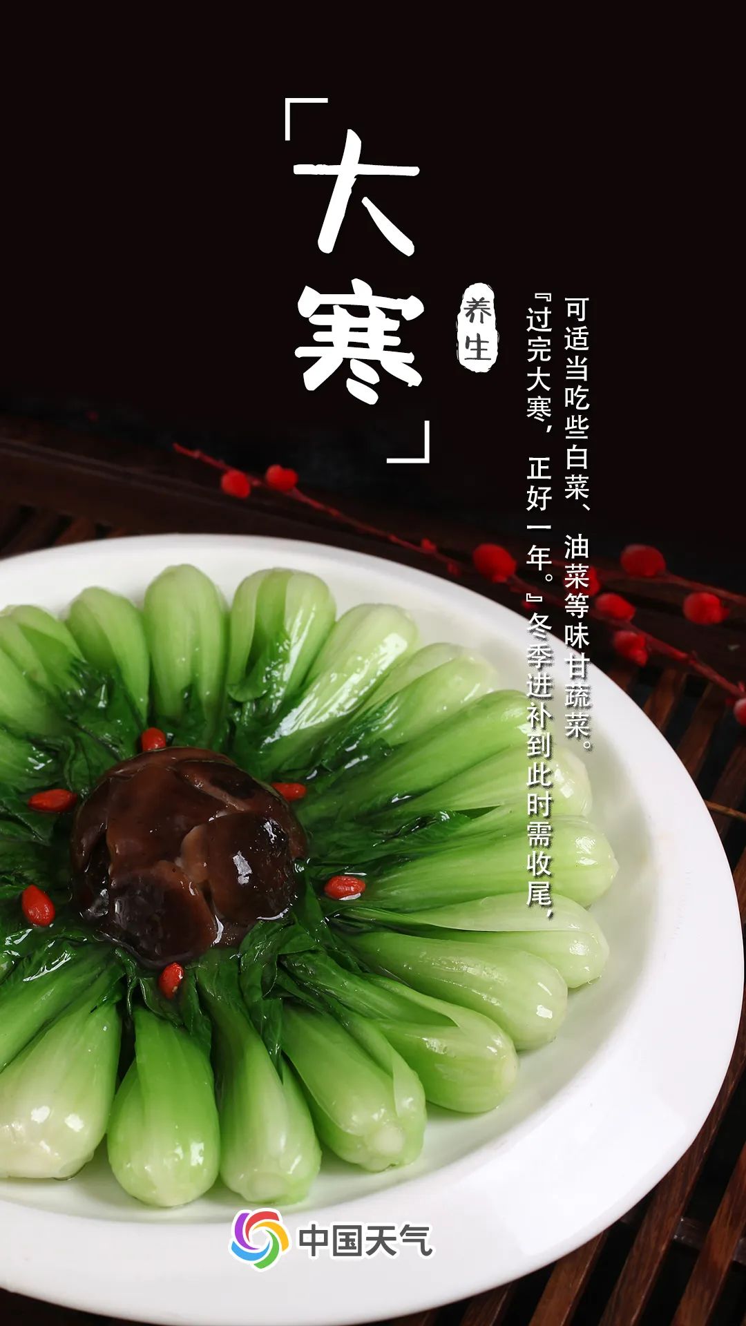 冬季进补到大寒时节需收尾,可适当吃些白菜、油菜、胡萝卜、菜花等味甘蔬菜,以逐渐适应即将到来的春季阳气升发的气候特点。此外,大寒正值三九刚过、四九之初,此时外出需适当增添衣物,注意头颈、腰、膝、踝部位的保暖,预防感冒、头痛、颈椎病发生。