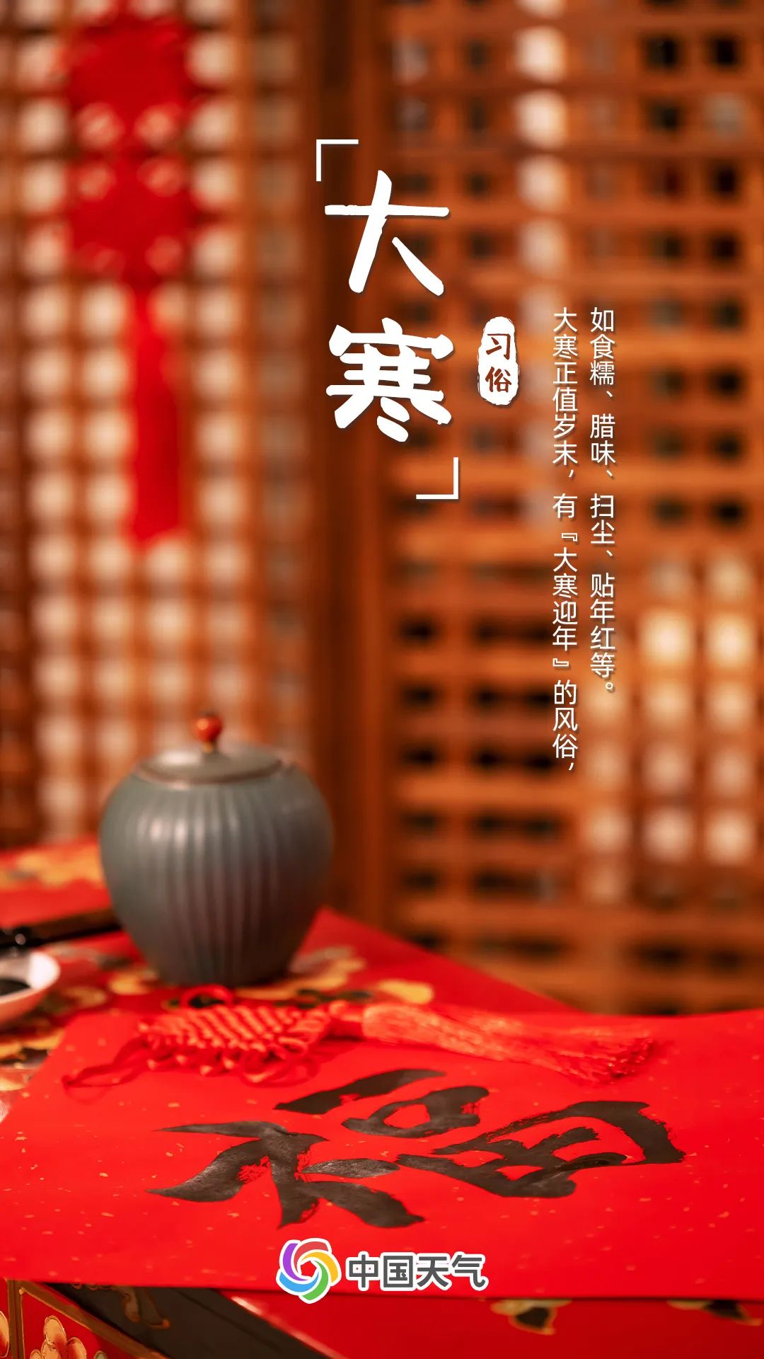 大寒正值岁末,有“大寒迎年”的习俗,如食糯、扫尘、纵饮、做牙、贴年红等。民间认为糯米比大米含糖量高,食用后全身感觉暖和,利于驱寒,同时糯米饭寓意温暖吉祥,从年头暖到年尾。