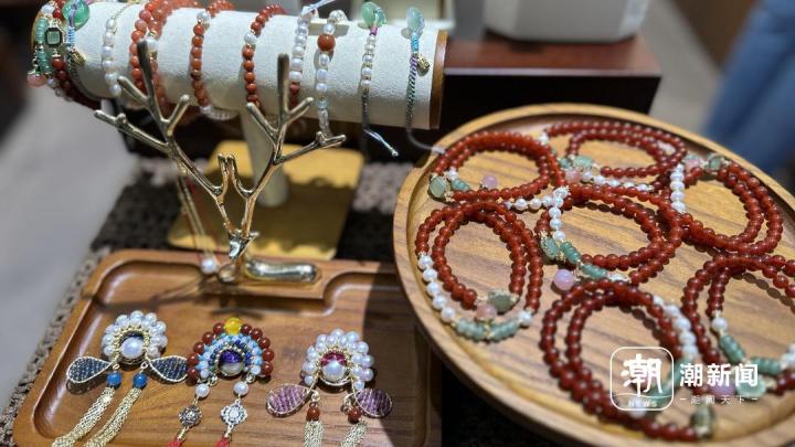 该店铺面积不大,却摆放着三四千款珍珠产品。镶嵌玉石的珍珠手链、混合着红玛瑙珠的珍珠项链……该店老板孙灵娟向潮新闻记者介绍,最热销的当属珍珠刀马旦胸针。