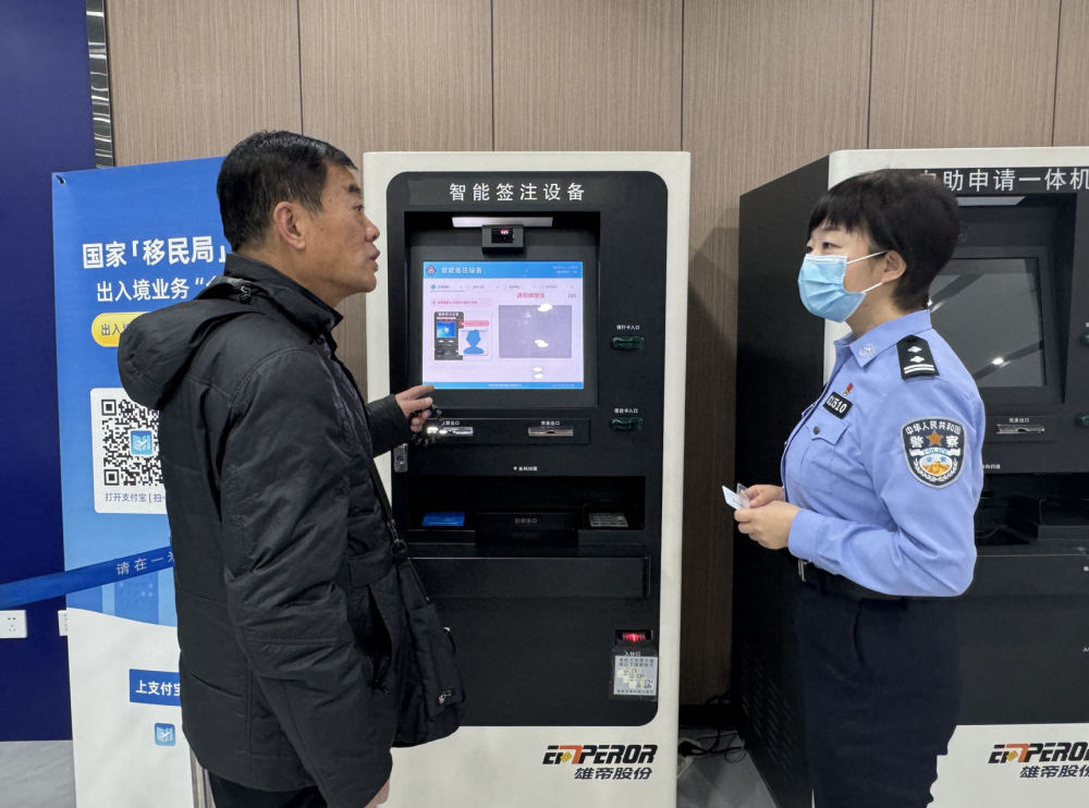 1月11日,在甘肃省兰州市公安局出入境接待大厅,工作人员引导前来办理出入境证件的市民使用智能签注机。新华社记者 任延昕 摄