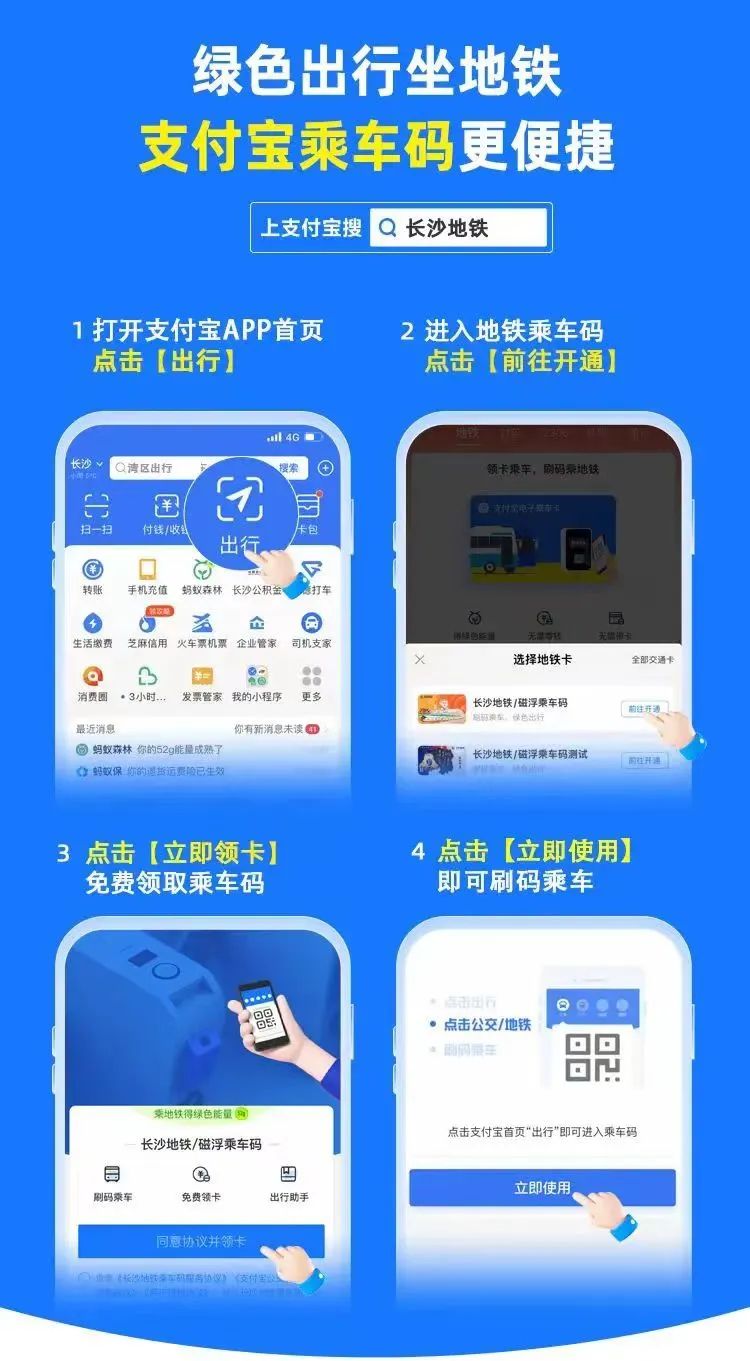 即日起,市民乘客可通过支付宝APP实现长沙地铁、长沙磁浮快线扫码进站。首次使用支付宝乘车,您只需打开APP,点击首页“出行”,选择页面上方“地铁”,即可免费领取乘车码。首次使用支付宝乘车操作只需这几步!↓↓