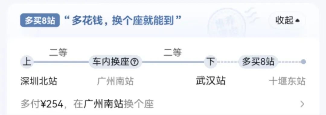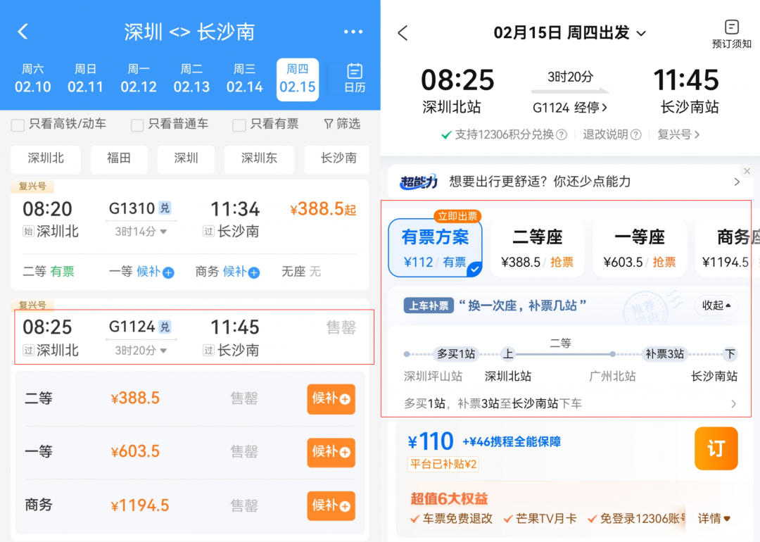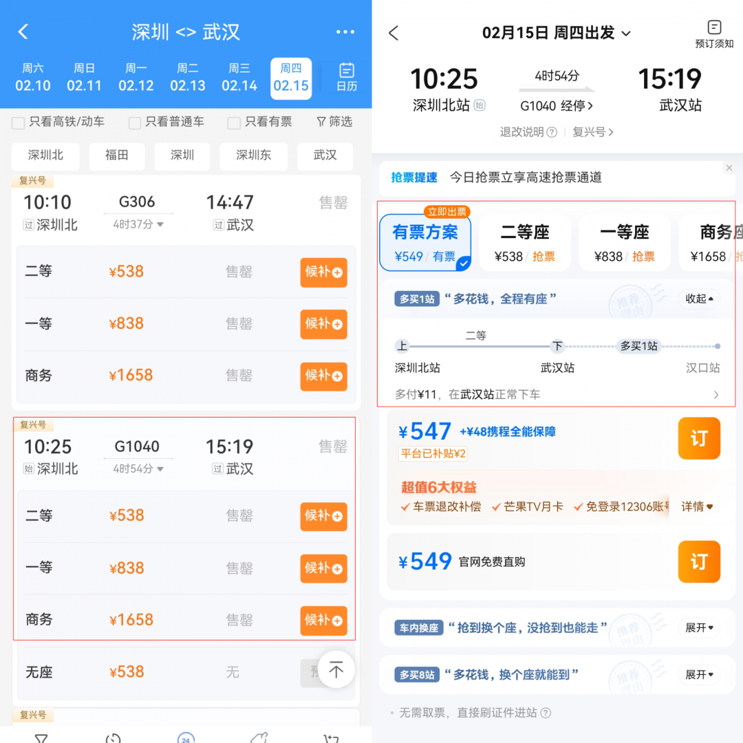 记者再次尝试,查询2月15日深圳北到武汉的火车票。以10时25分发车的G1040次列车为例,12306上显示售罄,第三方平台上则仍有余票,下方写着“多买一站‘多花钱,全程有座’”。此外,有票方案还有“车内换座‘抢到换个座,没抢到也能走’”“多买8站‘多花钱,换个座就能到’”等。