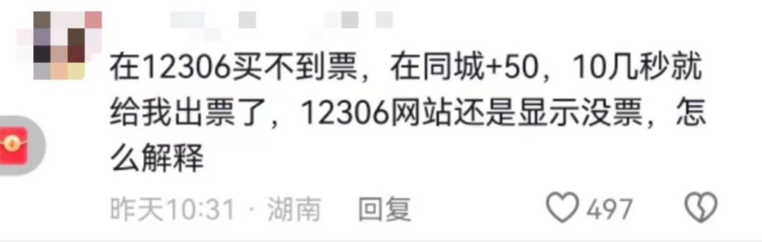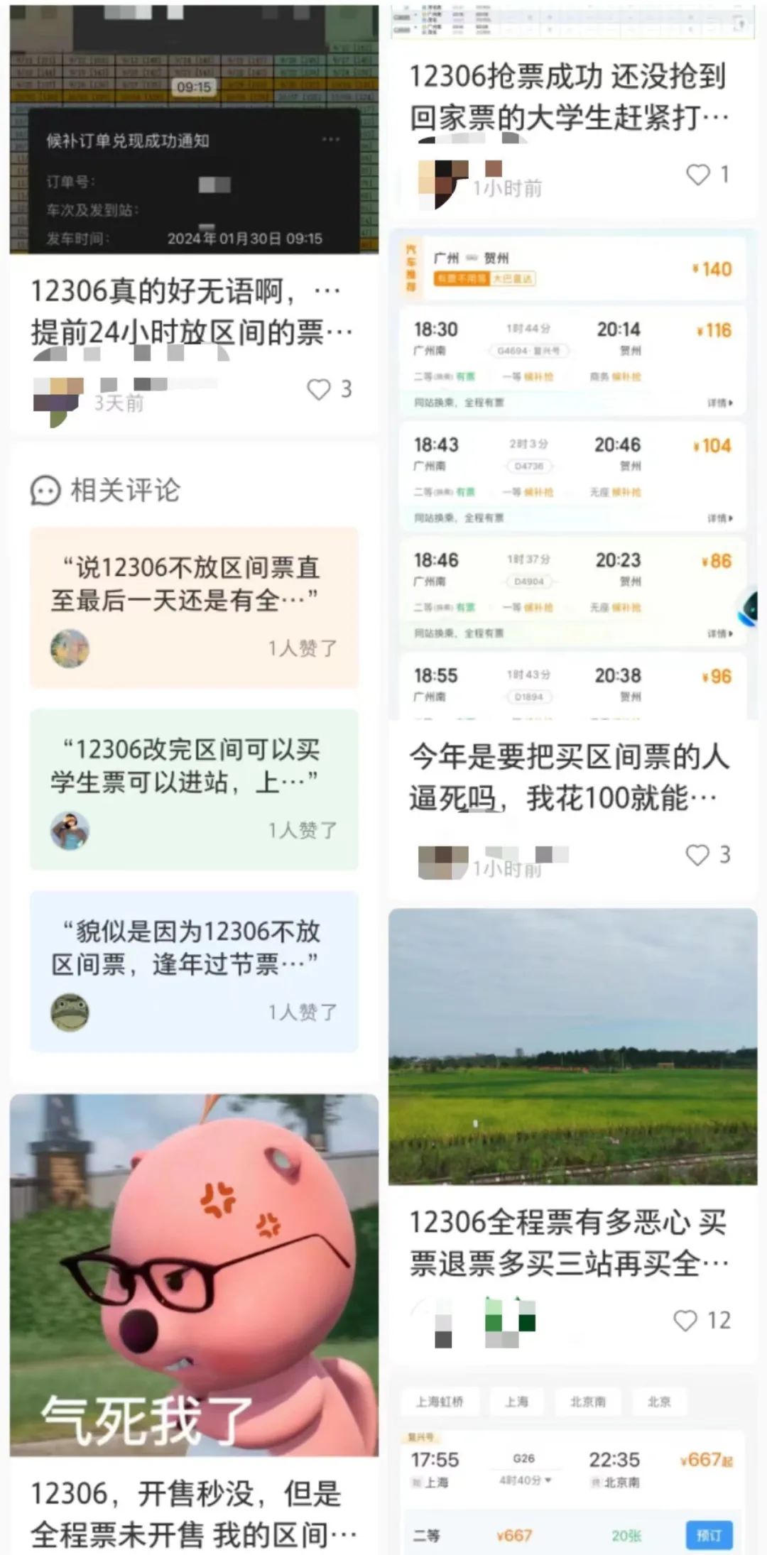 近日,还有多名网友在社交平台发文称,在12306平台买票时出现区间票开售“秒没”的情况,怀疑12306只投放全程票,故意让旅客“买长乘短”。