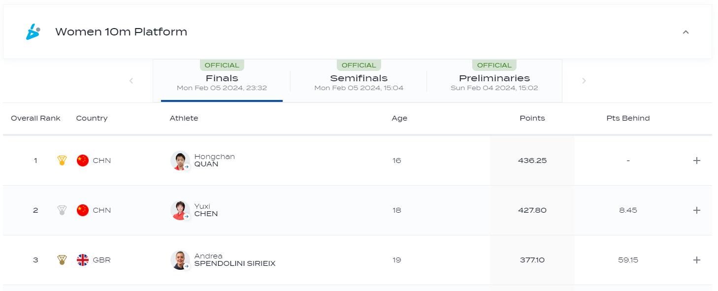 这场决赛,全红婵、陈芋汐又一次将季军远远甩在了身后,再度展现出在该项目上的绝对实力。
