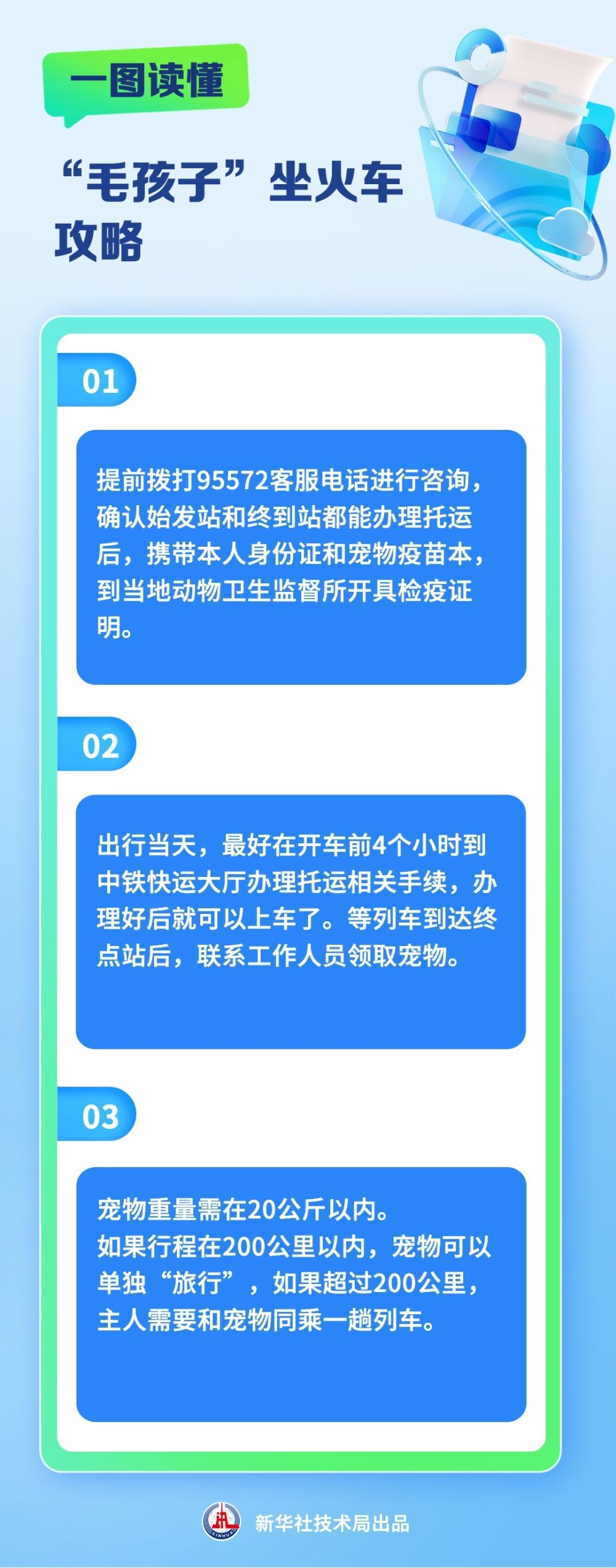 春节期间宠物怎么办,已经带回家的宠物怎么带回来?这成了返乡“铲屎官”们的大难题,也成了宠物们必须要过的“年关”。记者了解到,有些绿皮火车可以托运宠物,目前线路覆盖了部分省会和大中城市,具体可提前拨打中铁快运客服电话95572进行咨询。不过,根据相关规定,能够主动攻击伤害人的猛兽和蛇、蝎子、蜈蚣、蜂等不得承运。下面就带您了解一下“毛孩子”乘坐火车的流程。