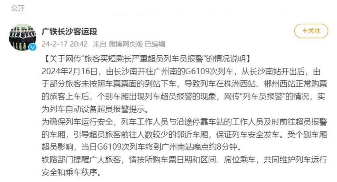 2月17日,@广铁长沙客运段 发布关于网传“旅客买短乘长严重超员列车员报警”的情况说明。2月16日,由长沙南开往广州南的G6109次列车,因部分旅客未按照车票票面的到站下车,导致个别车厢出现列车超员报警现象,列车无法行驶。网传“列车员报警”的情况,实为列车自动设备超员报警提示。为确保列车运行安全,列车工作人员与沿途停靠车站的工作人员及时前往超员报警的车厢,引导超员旅客前往人数较少的邻近车厢,确保列车安全发车。受个别车厢超员影响,当日G6109次列车终到广州南站晚点约8分钟。