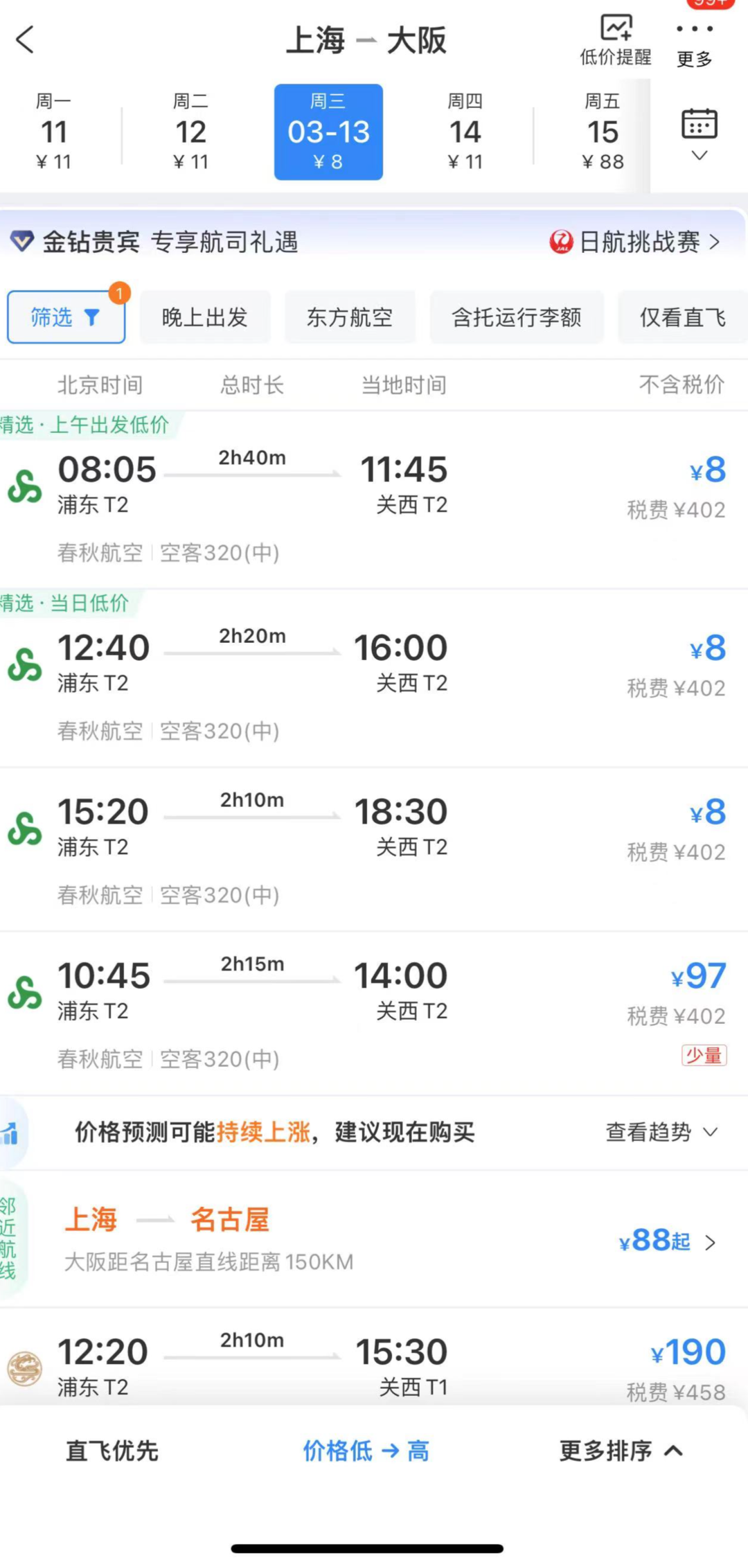 机票方面,有网友搜索上海飞日本机票时发现3月份从上海飞往大阪的航班惊现“8元机票”,该消息也在当日冲上微博热搜。