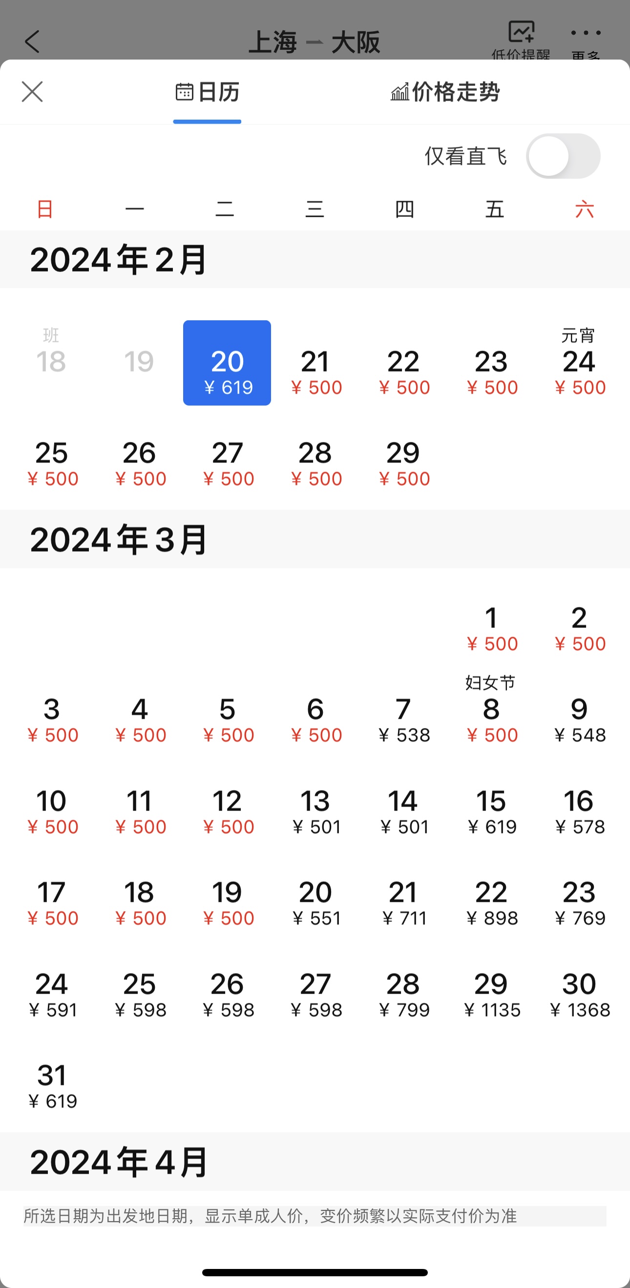 虽然目前在航空公司官网和在线旅游平台都已搜不到该价格的机票,但记者搜索发现,截至3月下旬,上海-大阪的航班最低含税价格也都在500元左右。