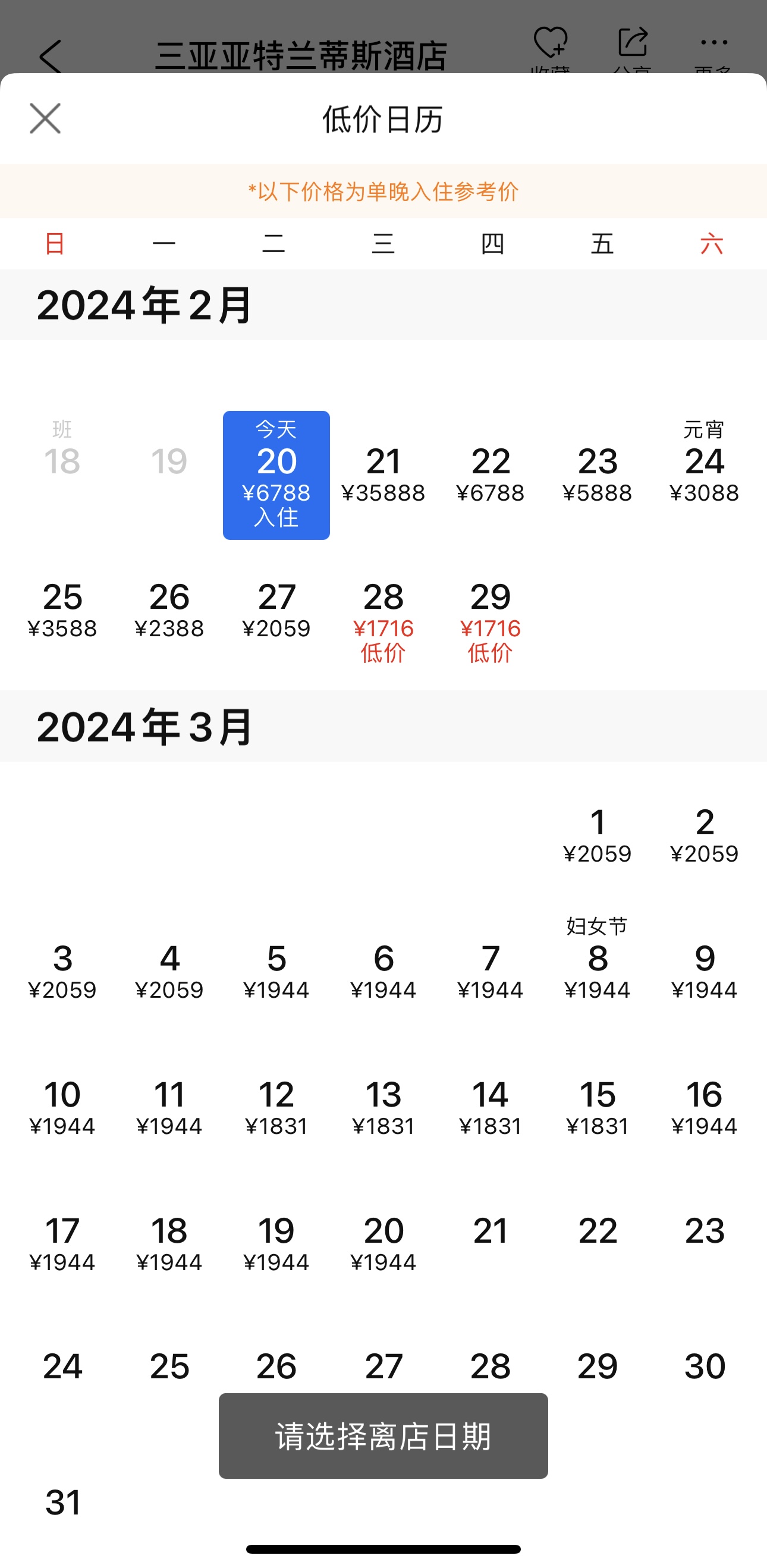 以三亚亚特兰蒂斯酒店为例,2月27日以后,该酒店可入住的最低价格每晚在2000元上下。而以“海景大师套房”为例,2月22日的入住价格为6788元,2月28日的入住价格为4116元,价格降了四成。
