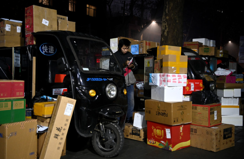 2月1日,西安市测绘路顺丰快递站点的工作人员在整理快件。新华社记者 刘潇 摄