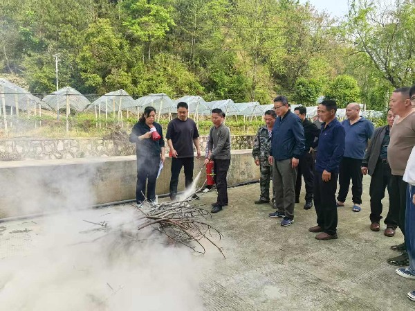 最后,森林防火应急演练在村部仓库旁开展。演练模拟村内林区发生火情的应急处置场景,现场工作人员首先详细讲解干粉灭火器“提、拔、握、压”标准操作步骤,逐一示范灭火动作,随后手把手指导参训人员实操练习,确保人人掌握灭火器使用技巧;同时,工作人员现场演示消防车操作规范,带领参训人员协助开展消防车接驳、出水灭火等实操训练,熟悉消防救援设备使用流程,提升初期火情快速处置能力,整个演练环节紧凑、处置规范,切实达到以练促学的效果。