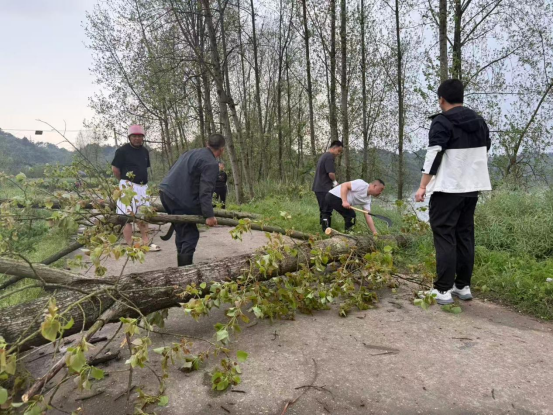镇应急分管领导潘广斌接报后,迅速向镇主要领导汇报,第一时间赶赴现场实施临时交通管制,疏散周边群众车辆。16时10分,受大风影响,大树倒伏阻断整条道路。16时20分,镇抢险队伍迅速赶到现场,利用油锯等专业工具冒雨开展切割、清运作业。全体工作人员争分夺秒、协同作战,仅用10分钟便完成全部清障工作,16时30分道路恢复安全畅通。