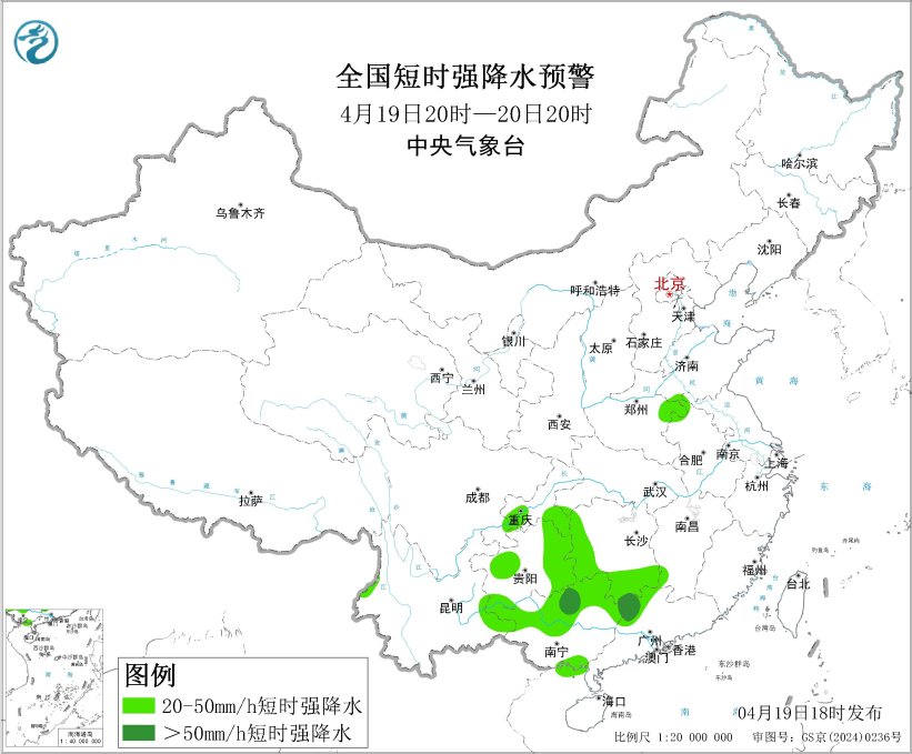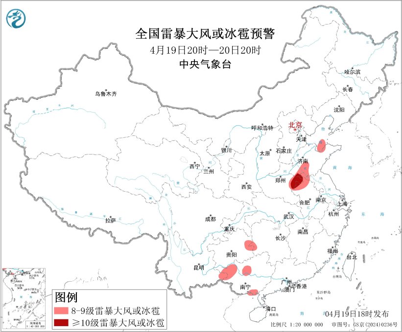 预计4月19日20时至20日20时,黄淮、西南地区东部、华南西部等地的部分地区将有8级以上雷暴大风或冰雹天气,其中,山东西南部、河南东部、安徽北部等地的部分地区将有10级以上雷暴大风,最大风力可达11级以上;黄淮中部、西南地区东部、江南西部、华南北部等地的部分地区将有小时雨量大于20毫米的短时强降水天气,其中,湖南南部、广西东北部、广东西北部等地的部分地区小时雨量大于50毫米,最大可达60毫米以上。