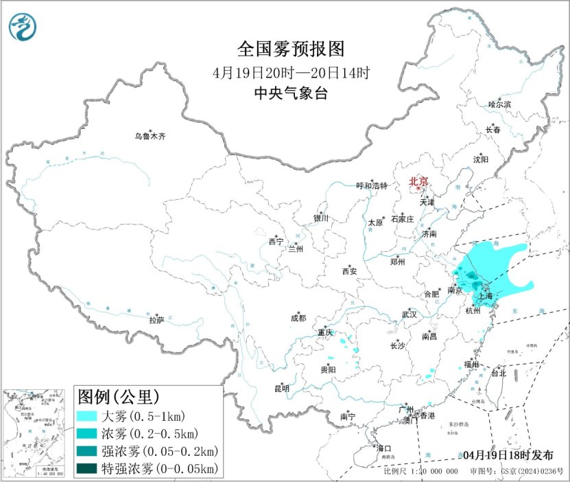 中央气象台4月19日18时继续发布大雾黄色预警: