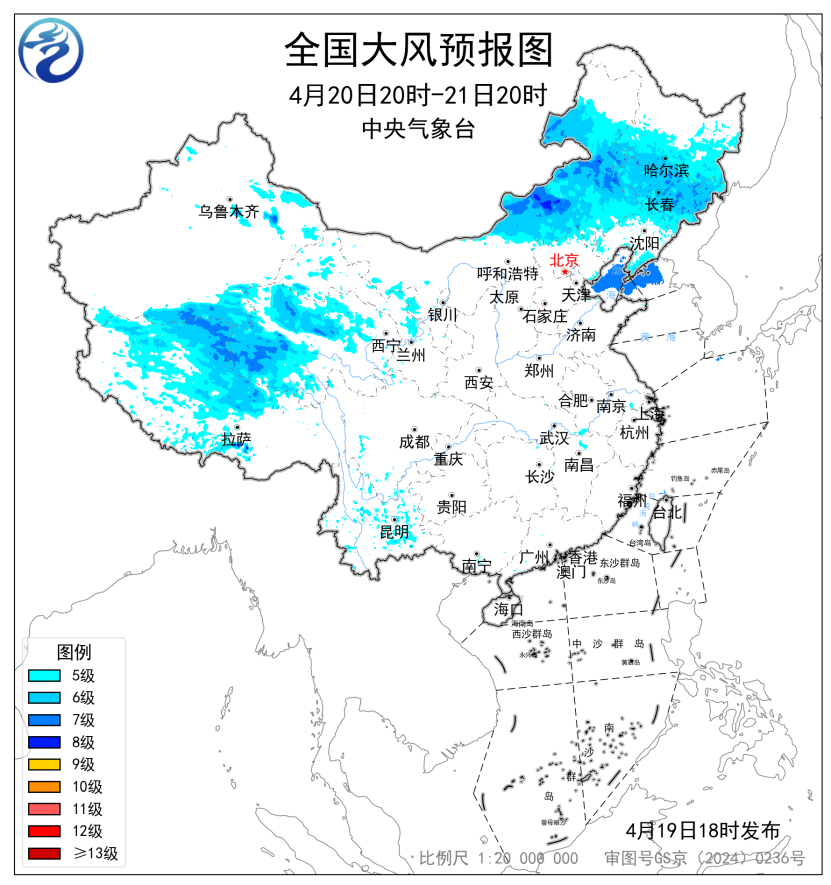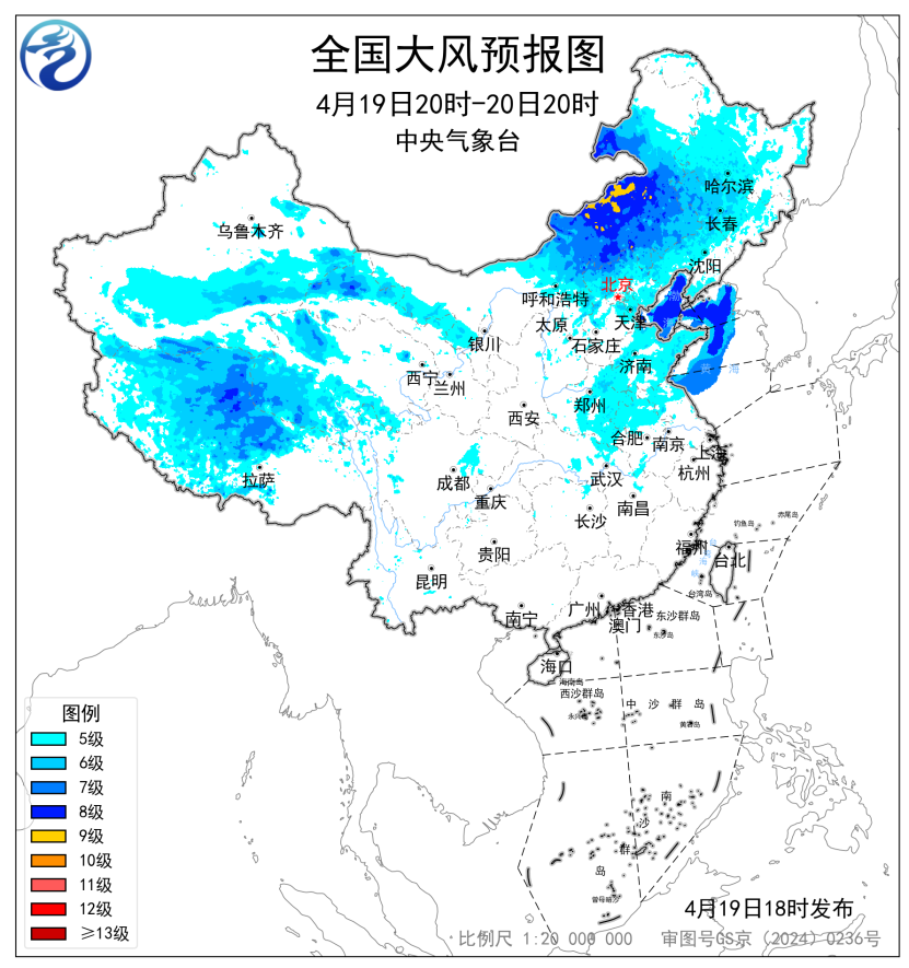 预计,4月19日20时至20日20时,新疆南疆东部和南疆盆地、西藏大部、青海西部、甘肃河西、内蒙古中东部、东北地区大部、山西北部、河北北部、北京、天津、黄淮大部、苏皖中北部等地部分地区有5~7级风,阵风8~9级,其中新疆东部山口、西藏北部、内蒙古中部局地有8~9级风,阵风10级以上;渤海、渤海海峡、黄海北部海域、黄海中西部和西南部部分海域将有7~8级、阵风9级的大风。